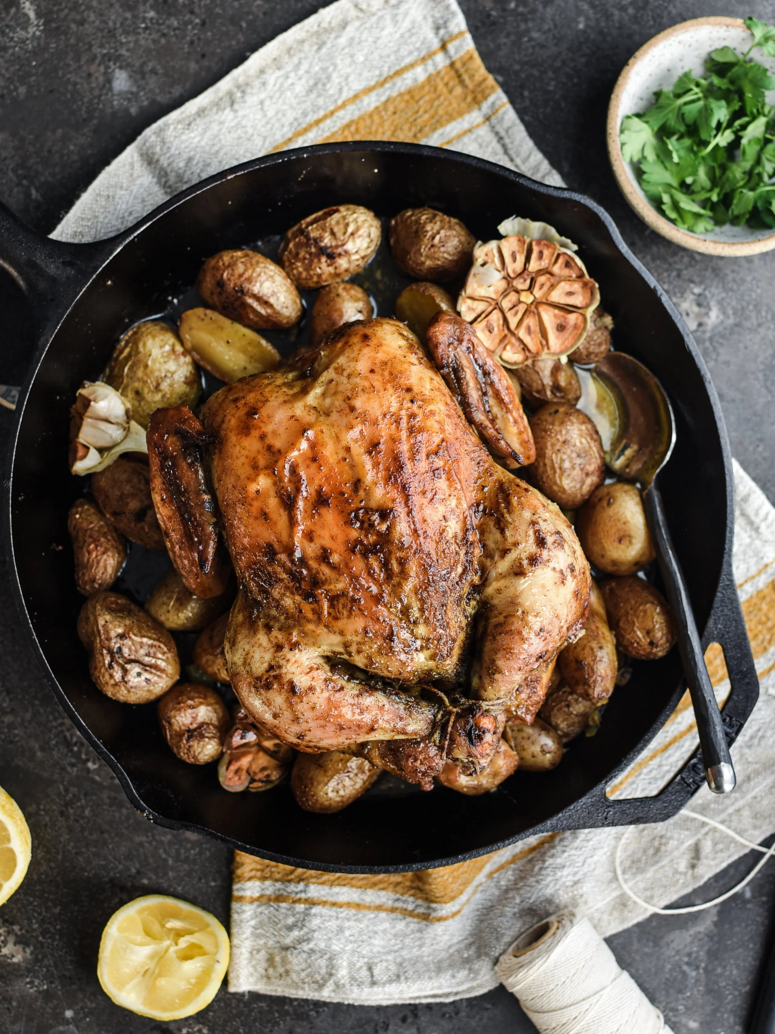 When a chilly evening or a lazy Sunday affords you a little more time, try this low-and-slow roast chicken. Although you can cook a chicken in less time, cooking it at a low oven temperature for a longer period of time gives you a meltingly tender, shreddable bird that tastes like it’s fresh off the rotisserie. The collagen in the chicken breaks down, and the fat in the skin gently renders, basting the potatoes below until they’re buttery and soft. I like to squeeze the roasted garlic into the potatoes and toss them in the chicken juices with a bit of lemon and some chopped parsley just before serving. Serve this chicken with a simple green salad or some crisp watercress tossed in a mustardy vinaigrette for a true French experience.